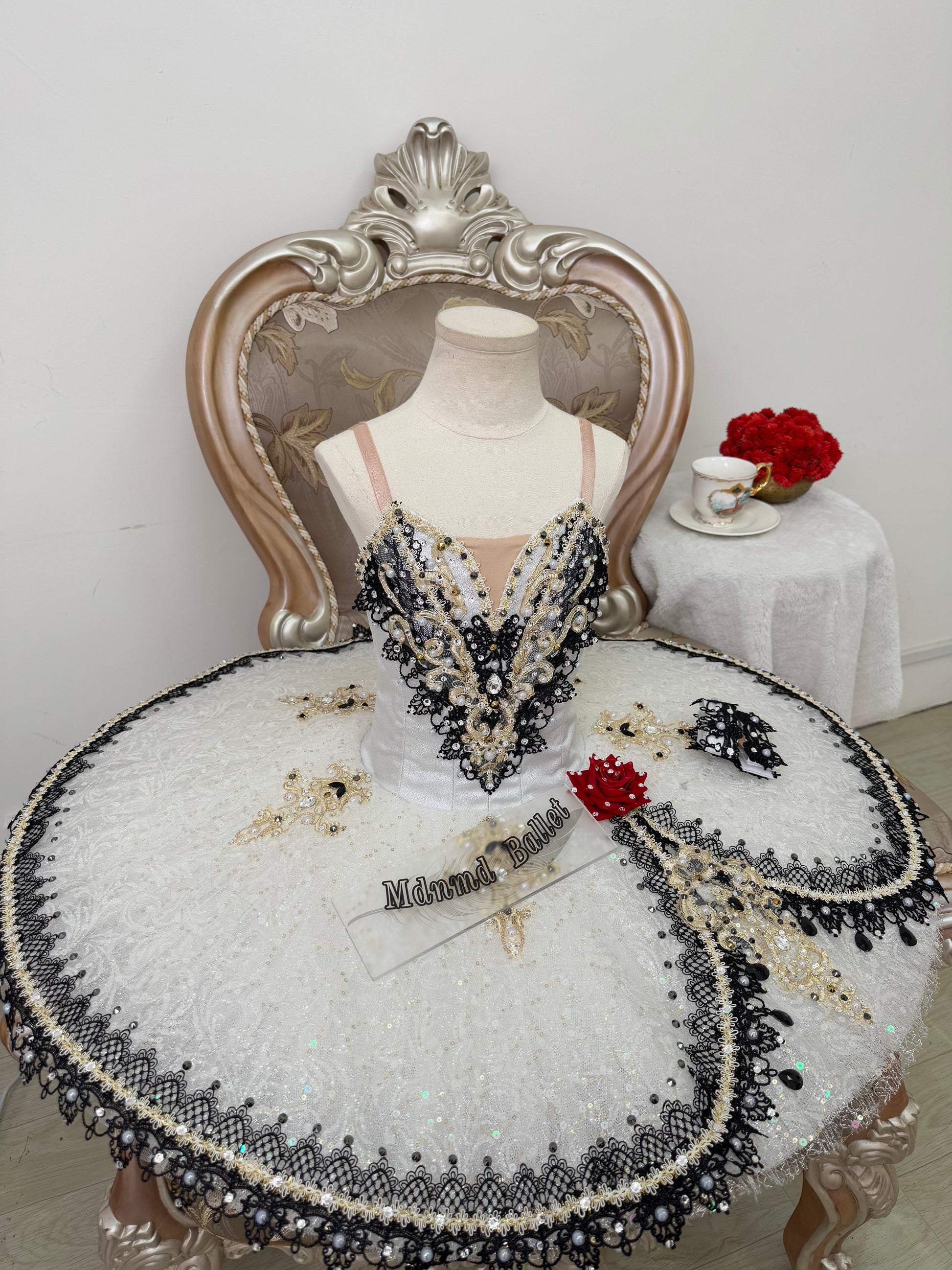 An elegant white ballet tutu adorned with lace and sequin embellishments.-MDT1282