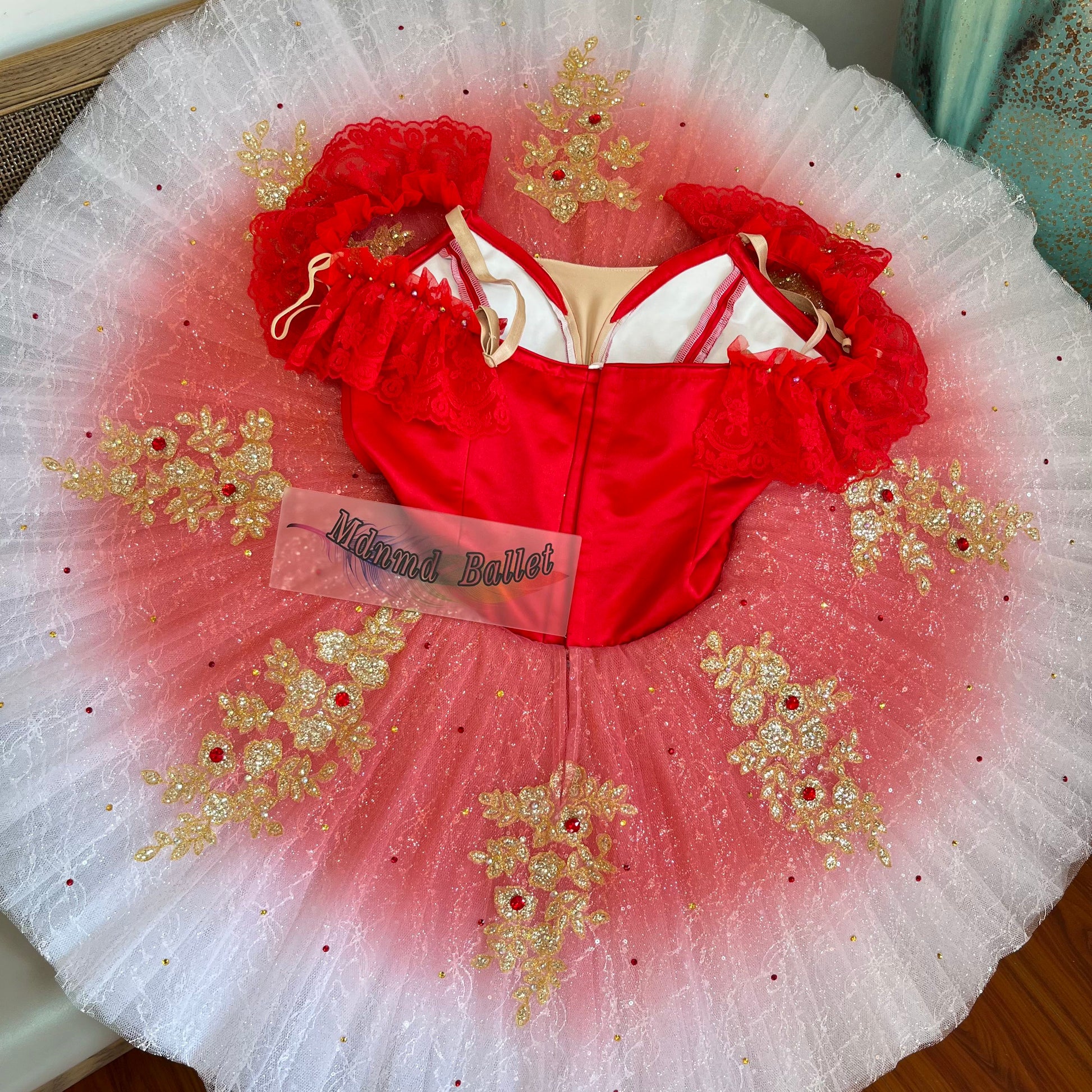 Red ballet short tutu, adorned with lace and sequin embellishments. Professional ballerina's ballet short tutu. -MDT0866